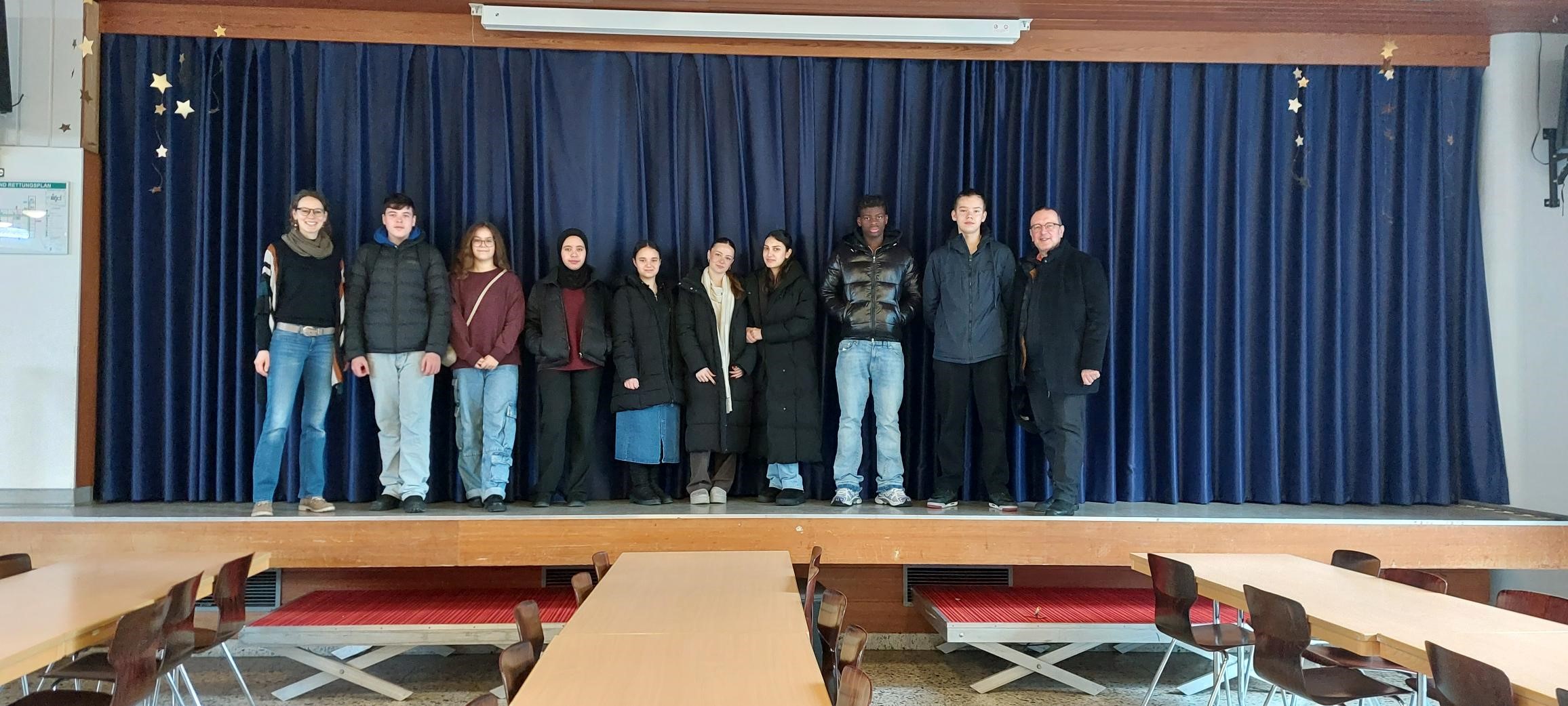 Auf dem Foto zu sehen sind (von links nach rechts): Eva Zegarek (Lehrerin), Tom Luca Herklotz, Fenja Bentrup, Samira Albunni, Renata Ustimenko, Stella Krenz, Sara Bibo, Othniel Afoakwah, Maksims Trubins, Jochen Momberg (Lehrer). Teilgenommen haben auch Romayssae Eddahbi und Levi Kapetzke.